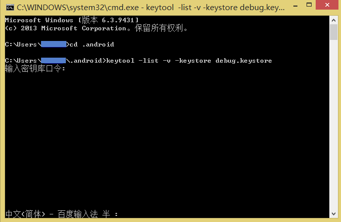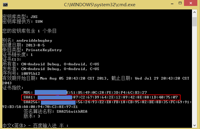 keytool -list -v -keystore 这里写上面生成的那个签名文件的全路径输入密码获取。 提示输入签名文件密码。输入密码后回车,此时可在控制台显示的信息中获取SHA1值,如下图所示: